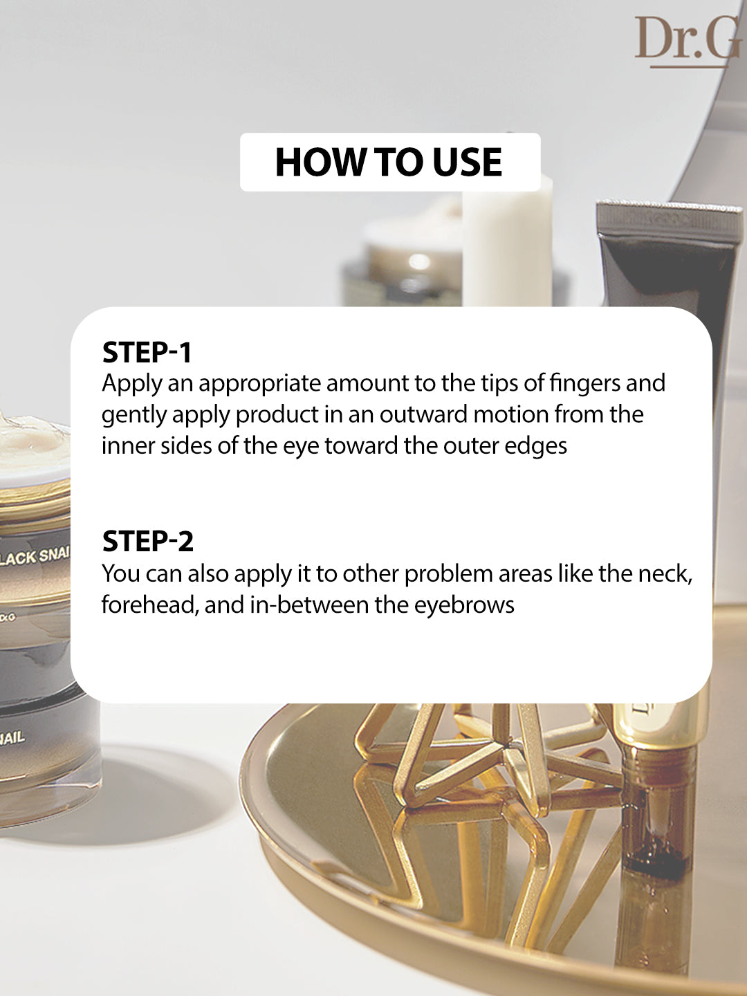 1. Apply an appropriate amount to the tips of fingers and gently apply product in an outward motion from the inner sides of the eye toward the outer edges