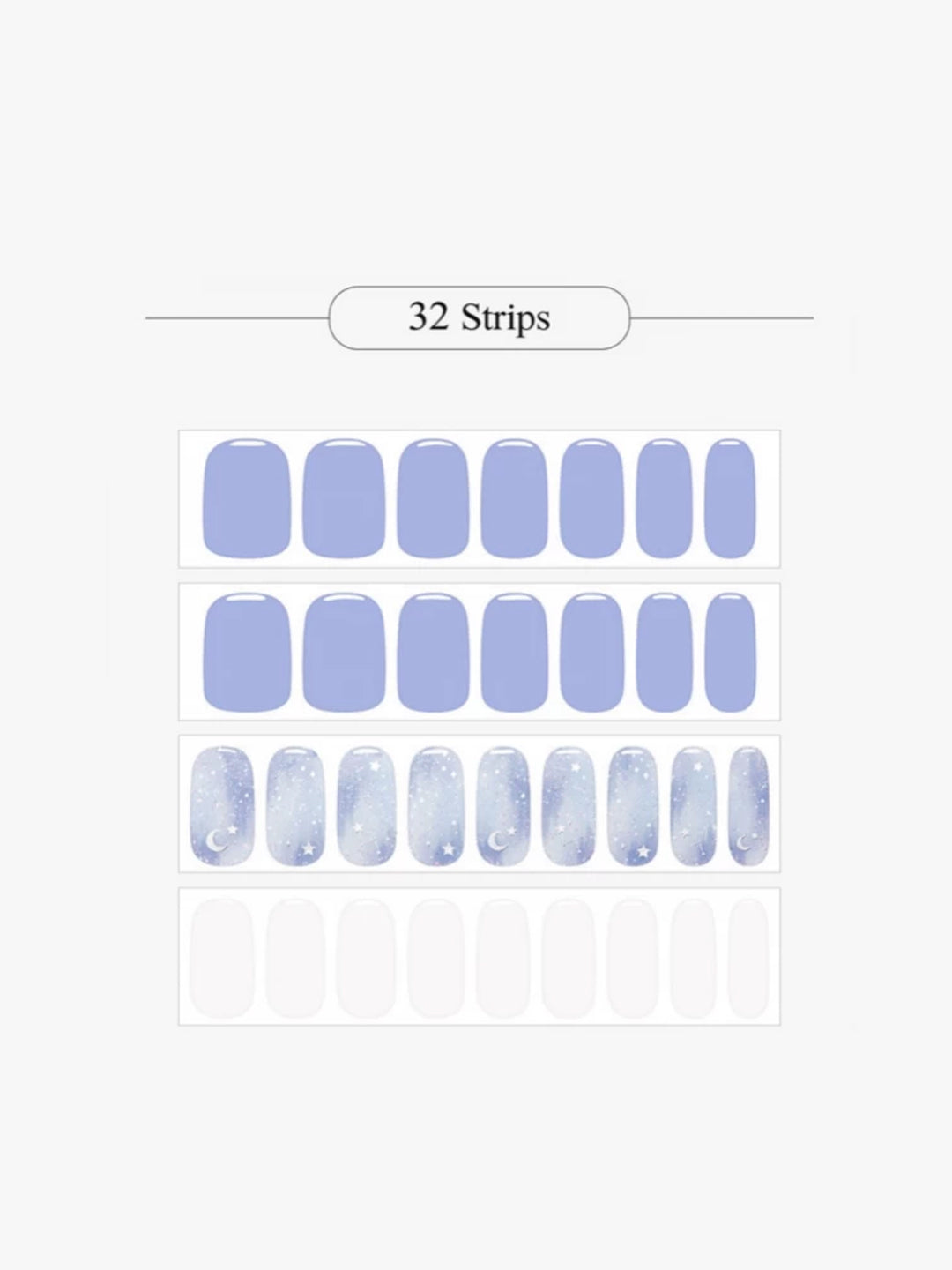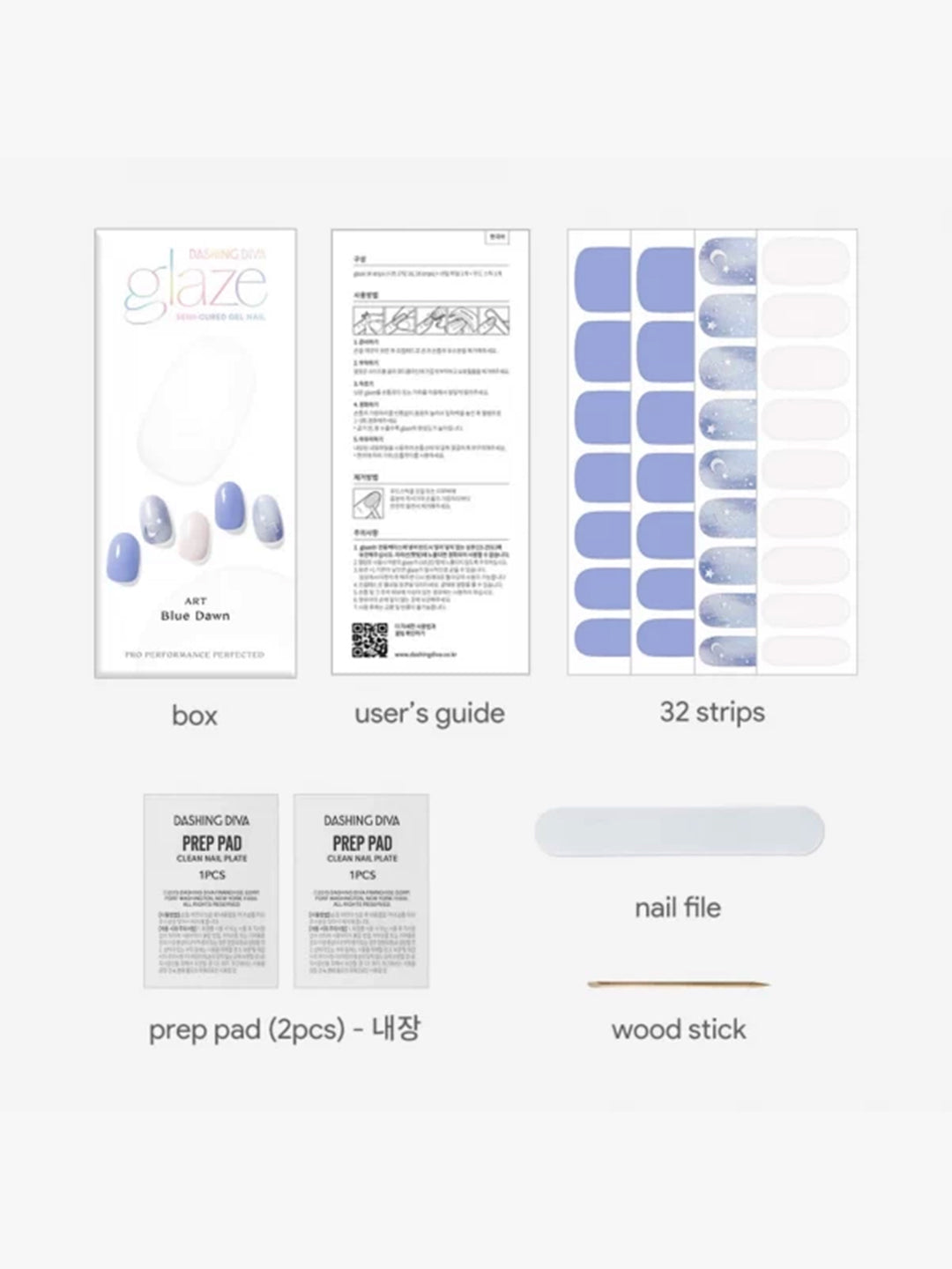 Includes: 32 semi-cured gel nail strips (in 12 sizes), Nail file, Manicure stick, 2 Prep pads