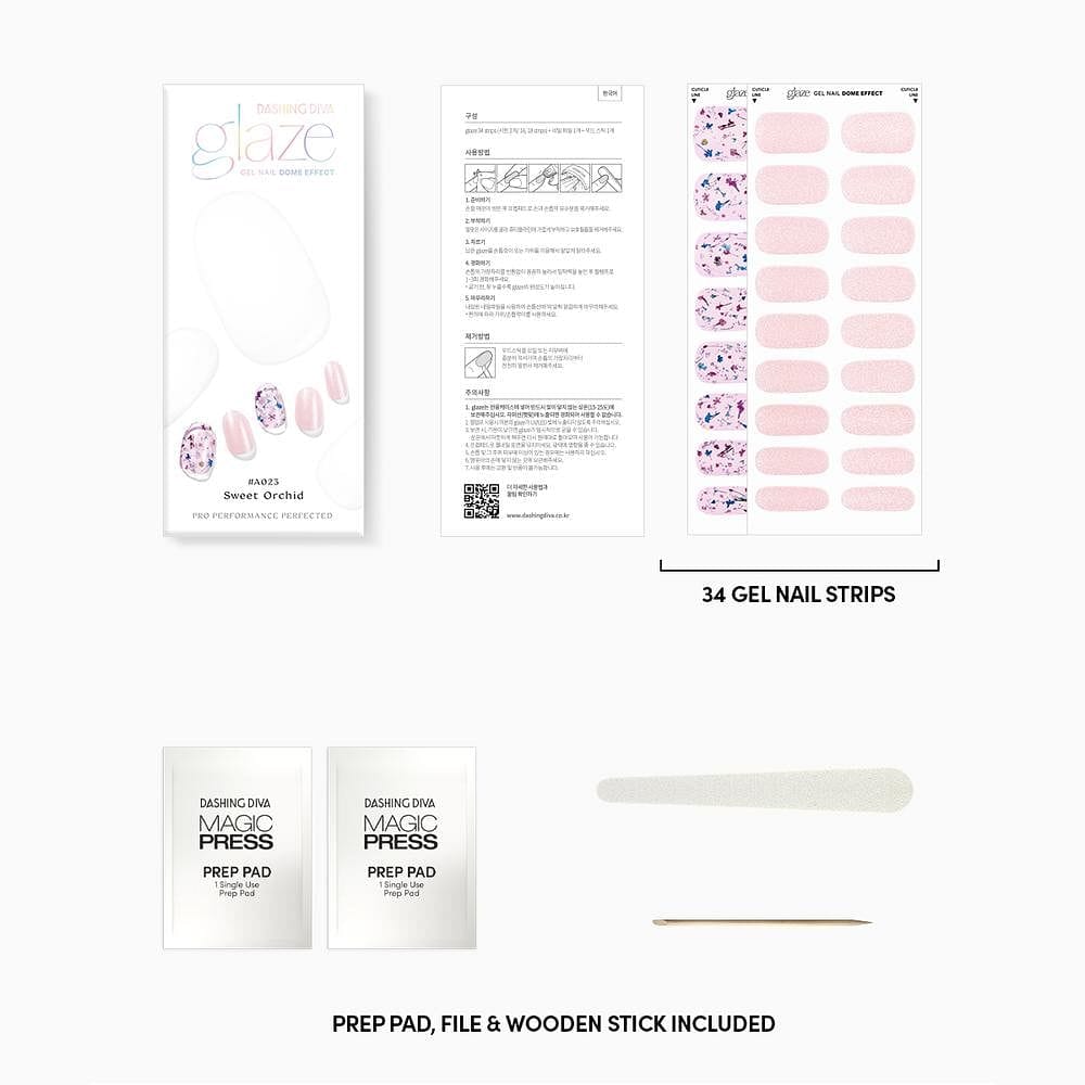 Includes: 34 semi-cured gel nail strips (in 12 sizes), Nail file, Manicure stick, 2 Prep pads