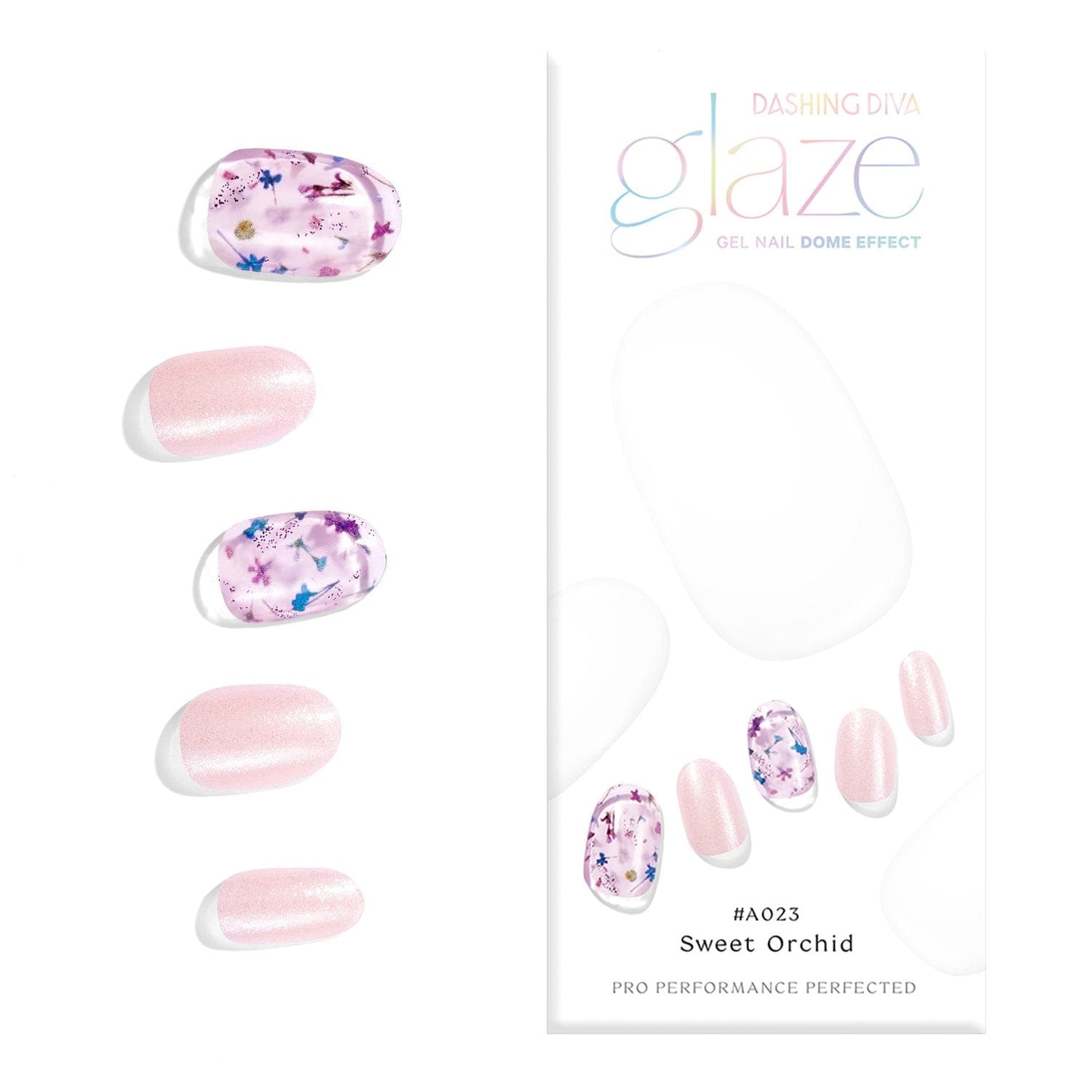 A soft pink silver shimmer base and perfectly pressed purple and blue sheer florals accent makes this glossy semi-cure gel mani the perfect combo.