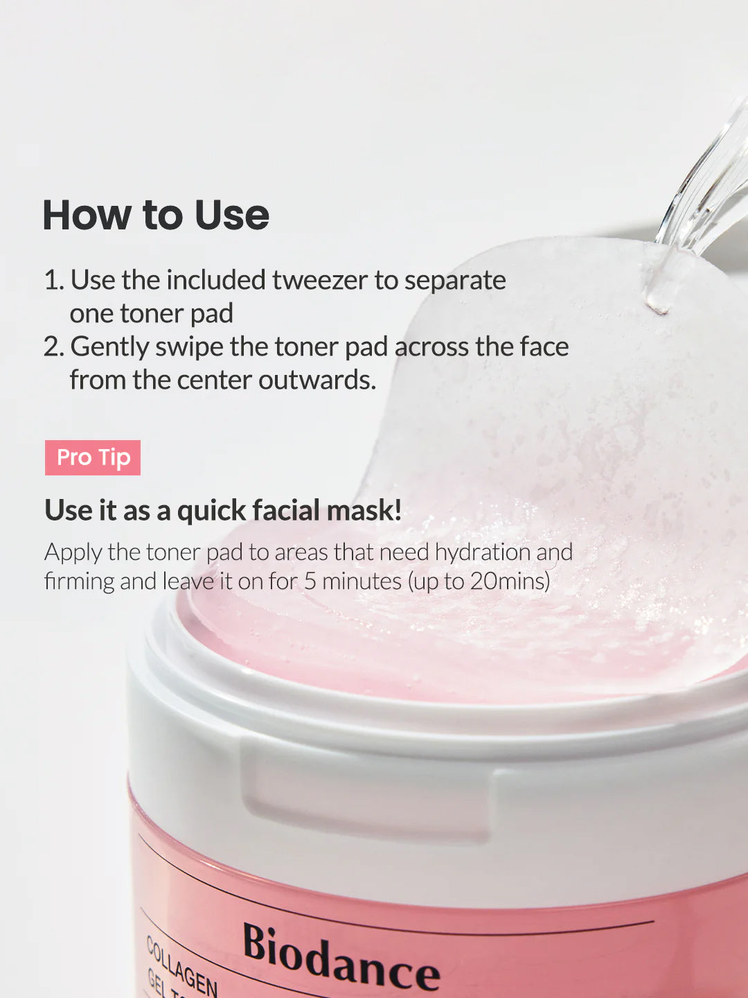Experience visible changes in skin elasticity improvement in just 2 weeks! The Biodance Collagen Gel Toner Pad are lightweight toner pads with a unique bouncy texture and enriched with 243Da collagen in a soft gel sheet for firmer and more elastic skin. Formulated with Biodance's expertly crafted collagen synergy ingredients, this product supports collagen production and enhances its connection within the skin. It addresses fundamental concerns about skin elasticity, tightens enlarged pores, and refines skin texture for a dewy glow without any irritation.