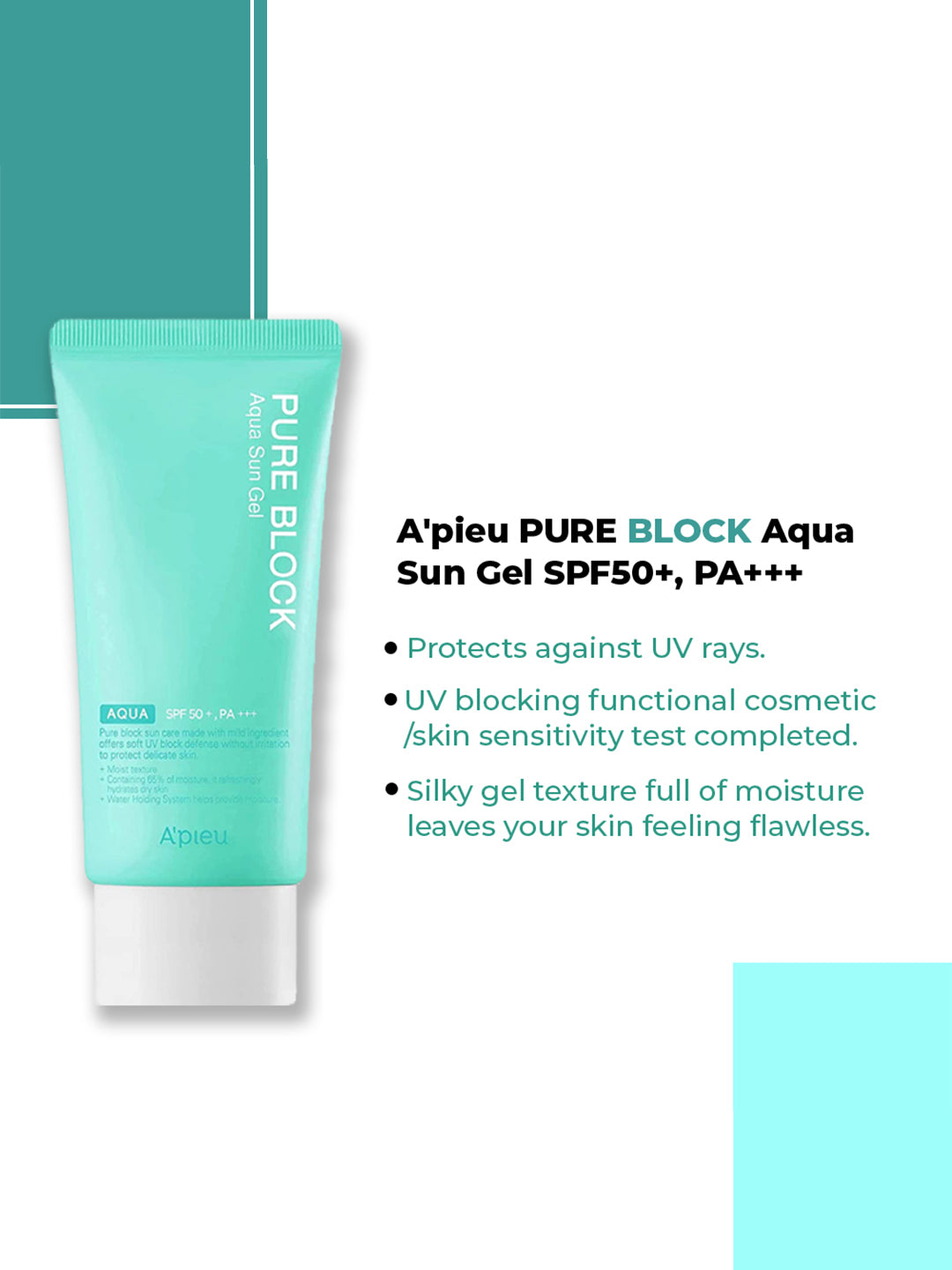 The Apieu Pure Block Aqua Sun Gel SPF50 PA+++ is a sunscreen in gel form with a high SPF of 50+ PA+++ protection and totally invisible, clear matte finish. The A’Pieu Pure Block Aqua Sun Gel 50ml will keep your skin protected from UV radiation without heaviness or stickiness. Plus, this sun gel can also be used as a “cool down” gel for sunburned or inflamed skin!