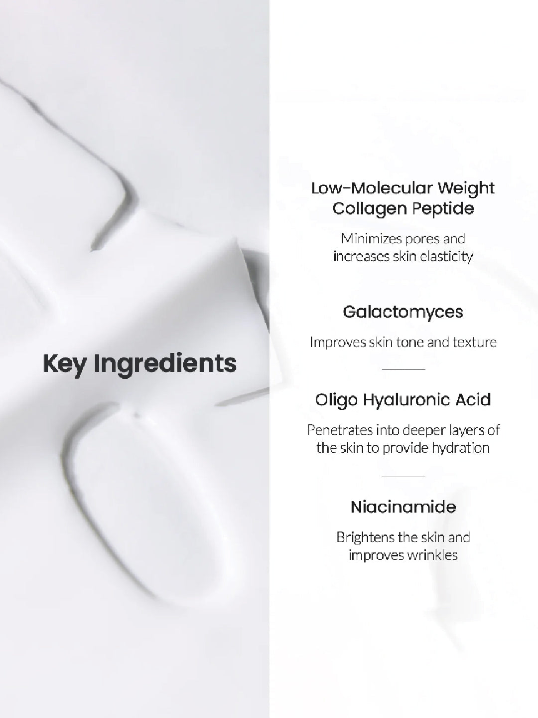 - Pore Tightening & Firming: Ultra-low molecular collagen refines enlarged pores, improves skin elasticity instantly after application and visibly smoothes out the appearance of fine lines and wrinkles.