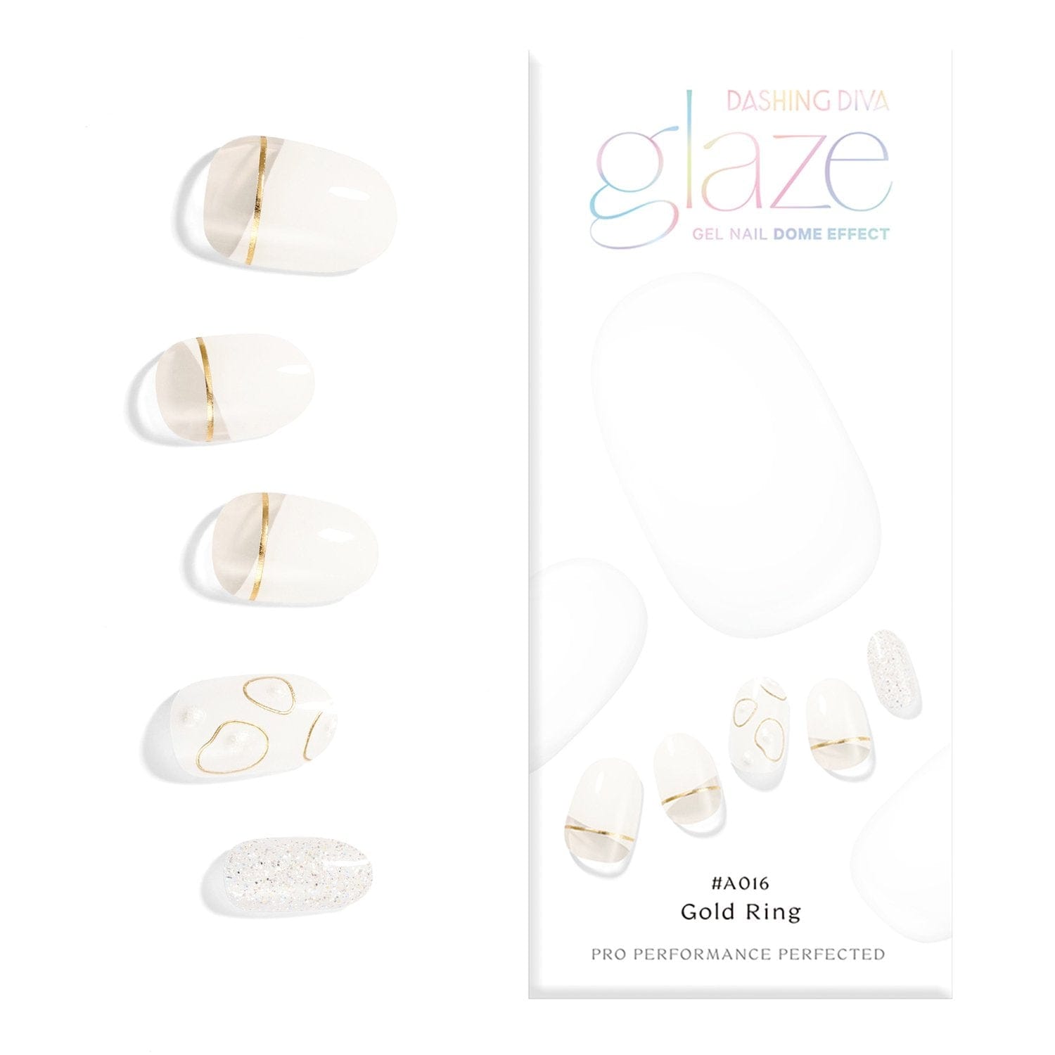 This sleek, sophisticated play on a classic french manicure with negative space and golden line breaks. White glitter accents and freehand art compliment the golden ring touch.
