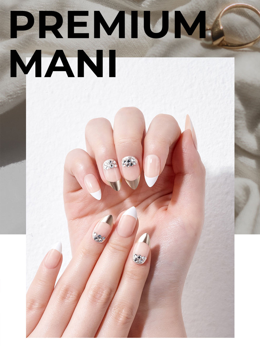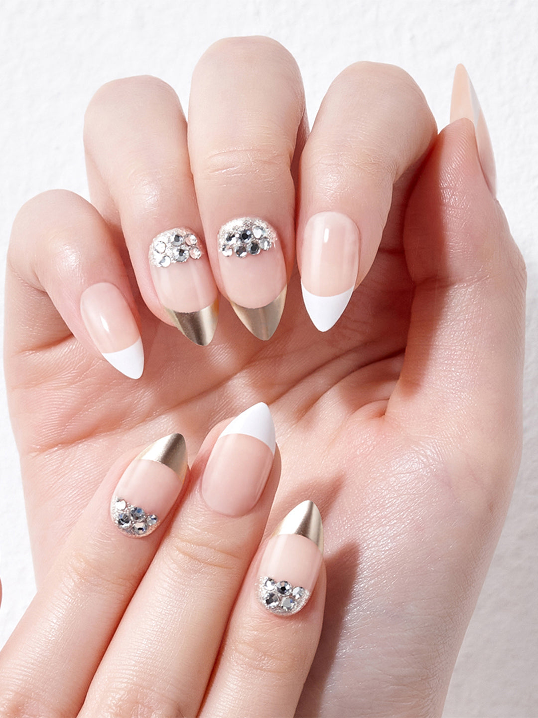 A chic stiletto shape nails with metal French and jewelry points for elegant and sophisticated nails.