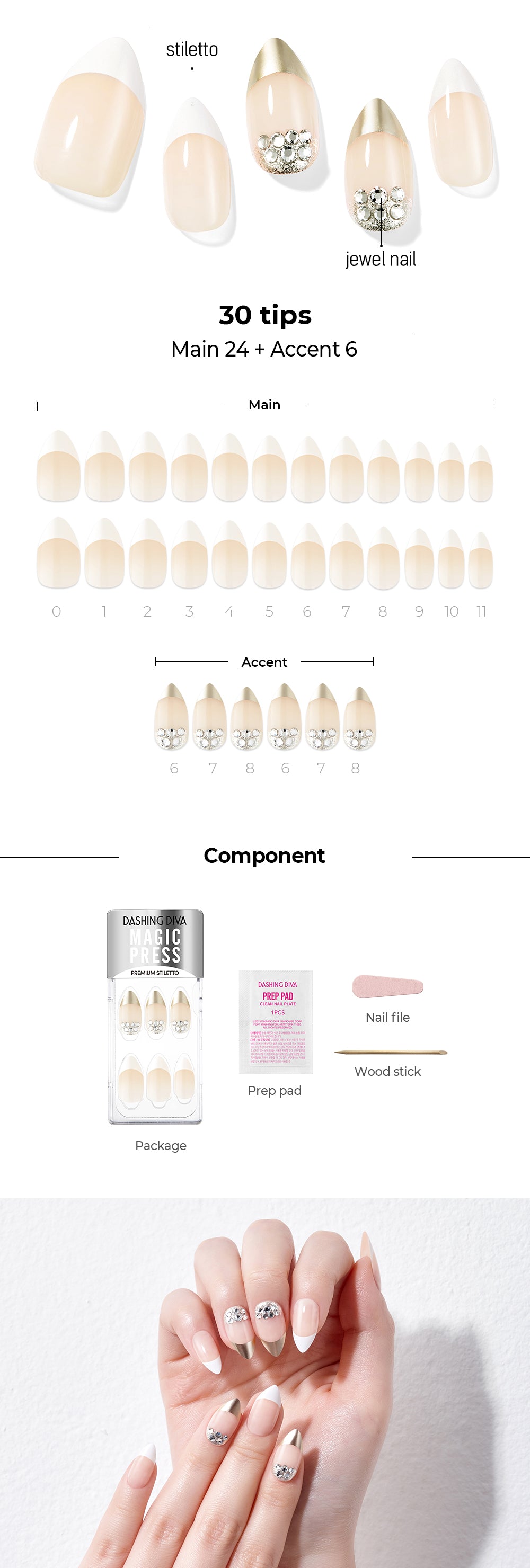 30 nail strips (in 12 sizes), Nail file, Manicure stick, Prep pad