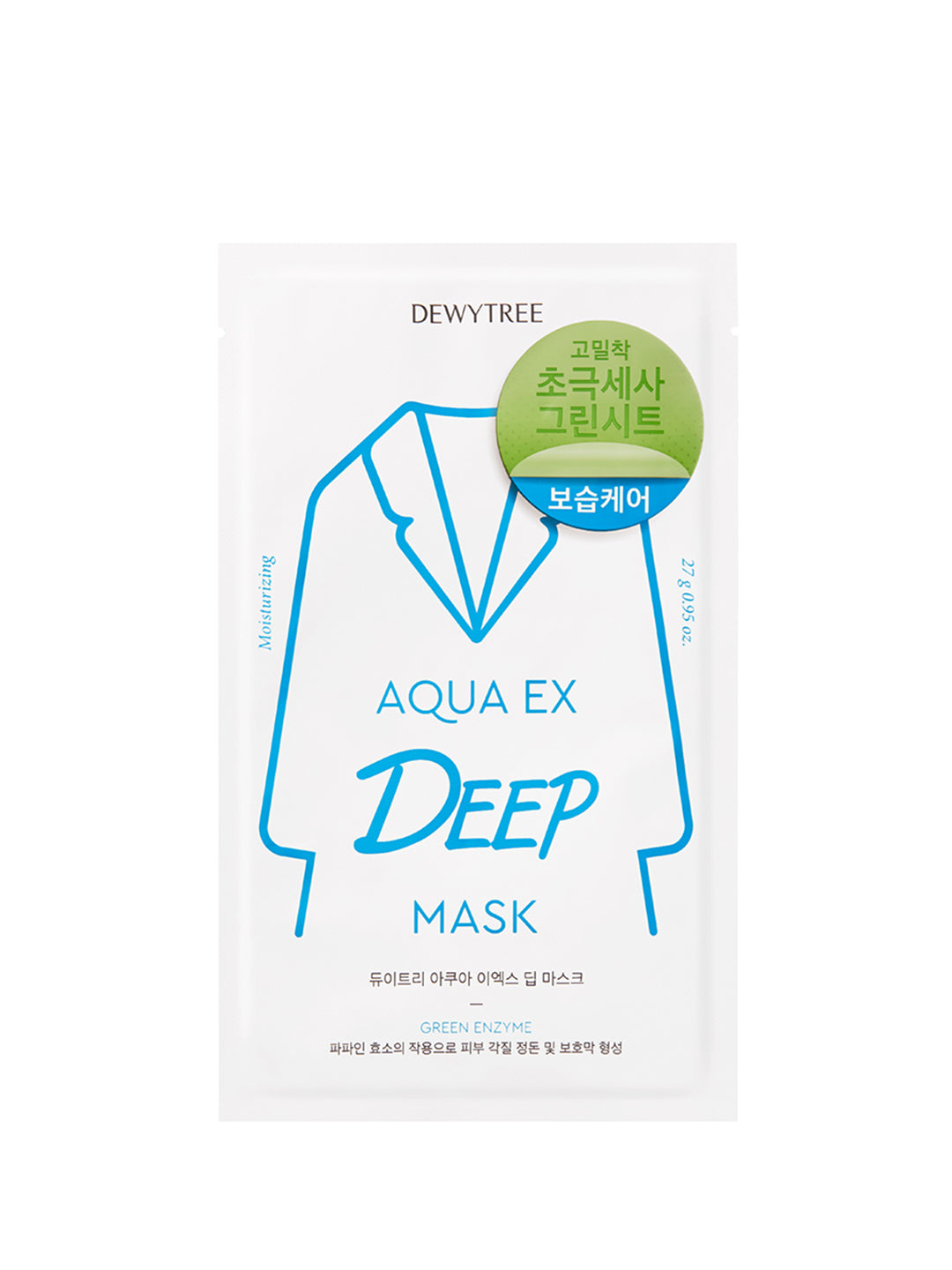 Dewytree Aqua Ex Deep Mask is a gentle green sheet mask that tidies up dead skin cells, strengthens the skin barrier, deeply hydrates, and improves the absorption of actives into the skin with Papain enzyme.