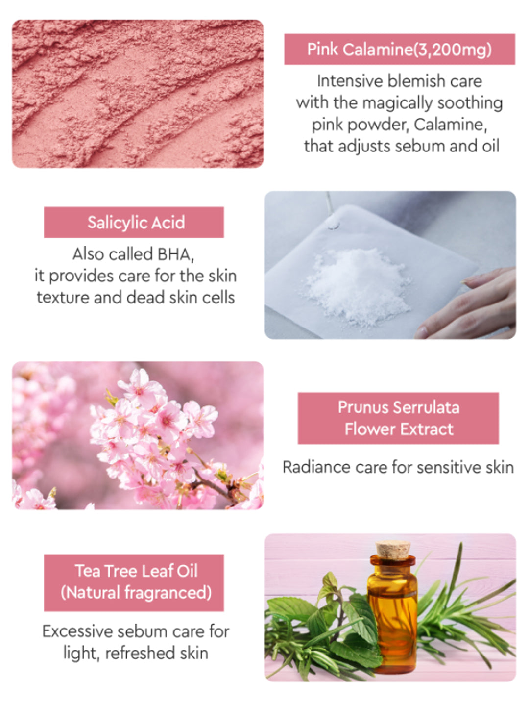 Water, Alcohol, Calamine, Glycerin, Titanium Dioxide, Camphor, Salicylic Acid, Butylene Glycol, Dimethyl Sulfone, Glycolic Acid, Prunus Serrulata Flower Extract, Silica, 1,2-Hexanediol, Aspergillus Ferment, Sorghum Bicolor Leaf/Stem Extract, Olea Europaea (Olive) Fruit Oil, Melaleuca Alternifolia (Tea Tree) Leaf Oil