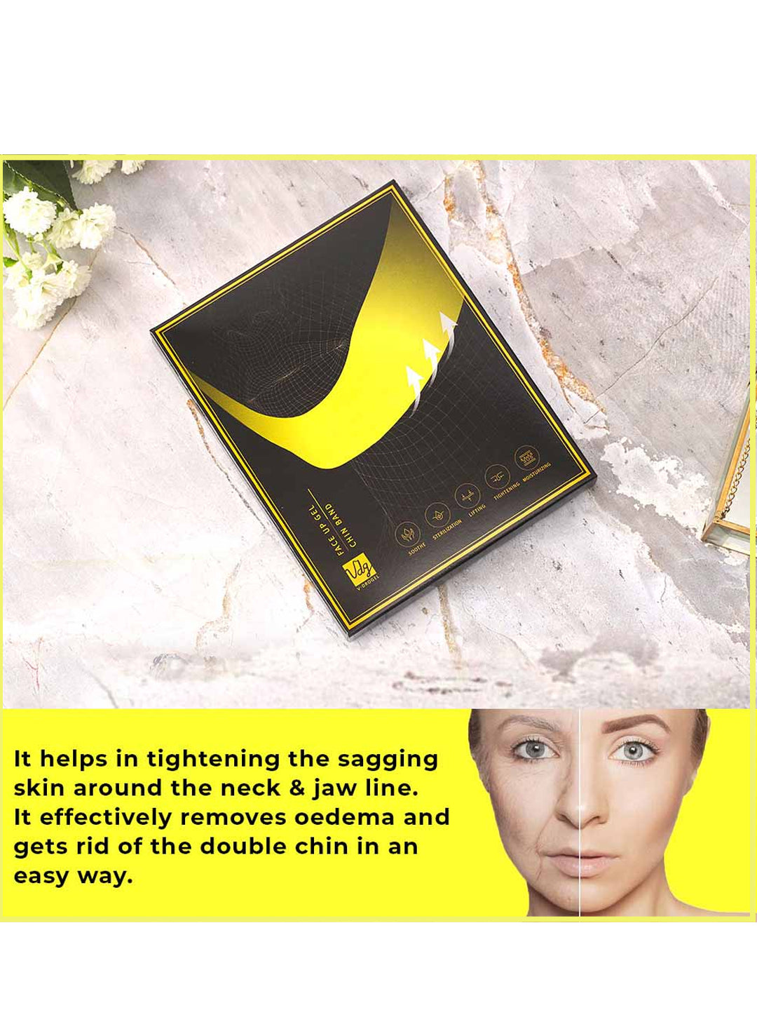 In FACE UP GEL CHIN BAND is made with highly elastic and resilient fabric. A perfect way to give yourself a facelift. It helps in tightening the sagging skin around the neck & jaw line. It effectively removes oedema and gets rid of the double chin in an easy way. With age, our skin loses firmness and elasticity, this Lifting Mask helps increase firmness and elasticity, giving a smoother, healthier-looking skin. Natural ingredients provide the skin nutrients and moisture. Hydrogel refreshes and instantly moisturizes the skin of your chin line, giving more care to the skin. Its best to use it in night, it is the peak time for the skin molecules to lift, the division during night time is faster than during the day, the absorption rate of nutrients in the skin is very high. Soft and comfortable material for facial skin.