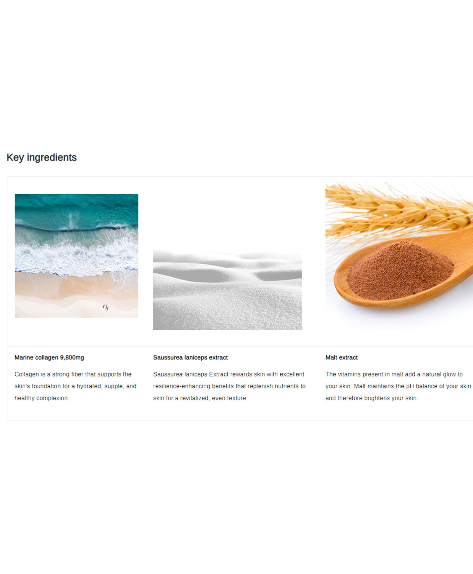Marine collagen 9,800mgCollagen is a strong fiber that supports the skin's foundation for a hydrated, supple, and healthy complexion. |
