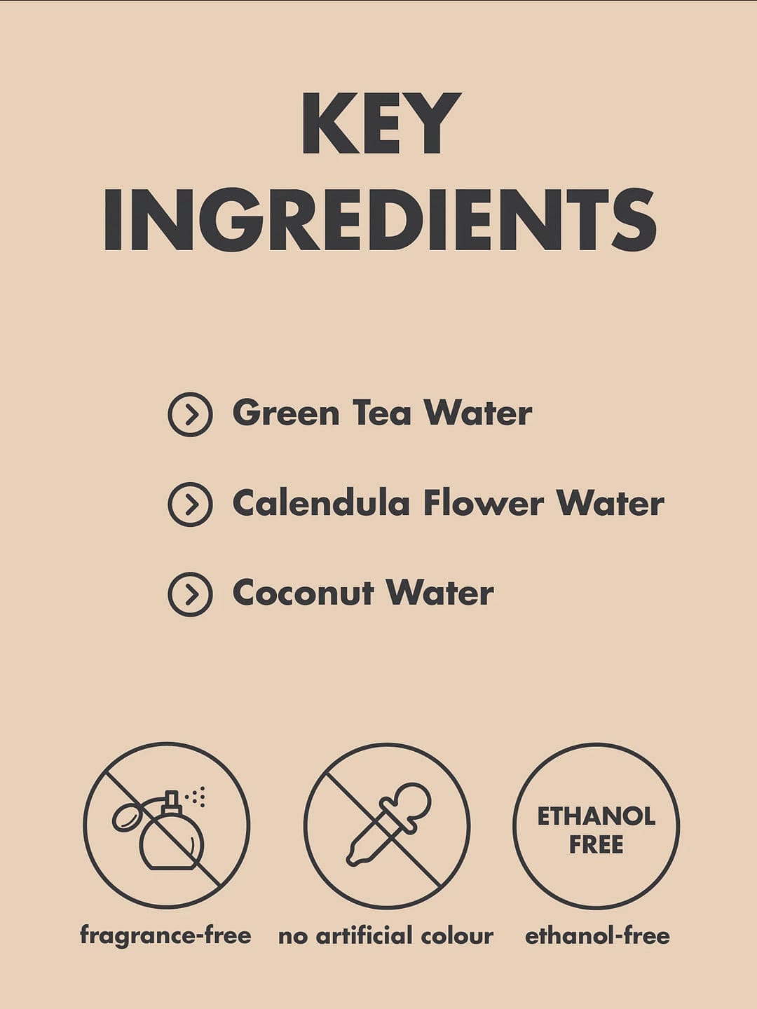 Camellia Sinensis Leaf Water, Aqua (Water), Glycerin, Propanediol, 1,2-Hexanediol, Butylene Glycol, Calendula Officinalis Flower Water, Cocos Nucifera (Coconut) Water, Betaine, Panthenol, Pantolactone, Trehalose, Sodium PCA, Sodium Citrate, Disodium EDTA