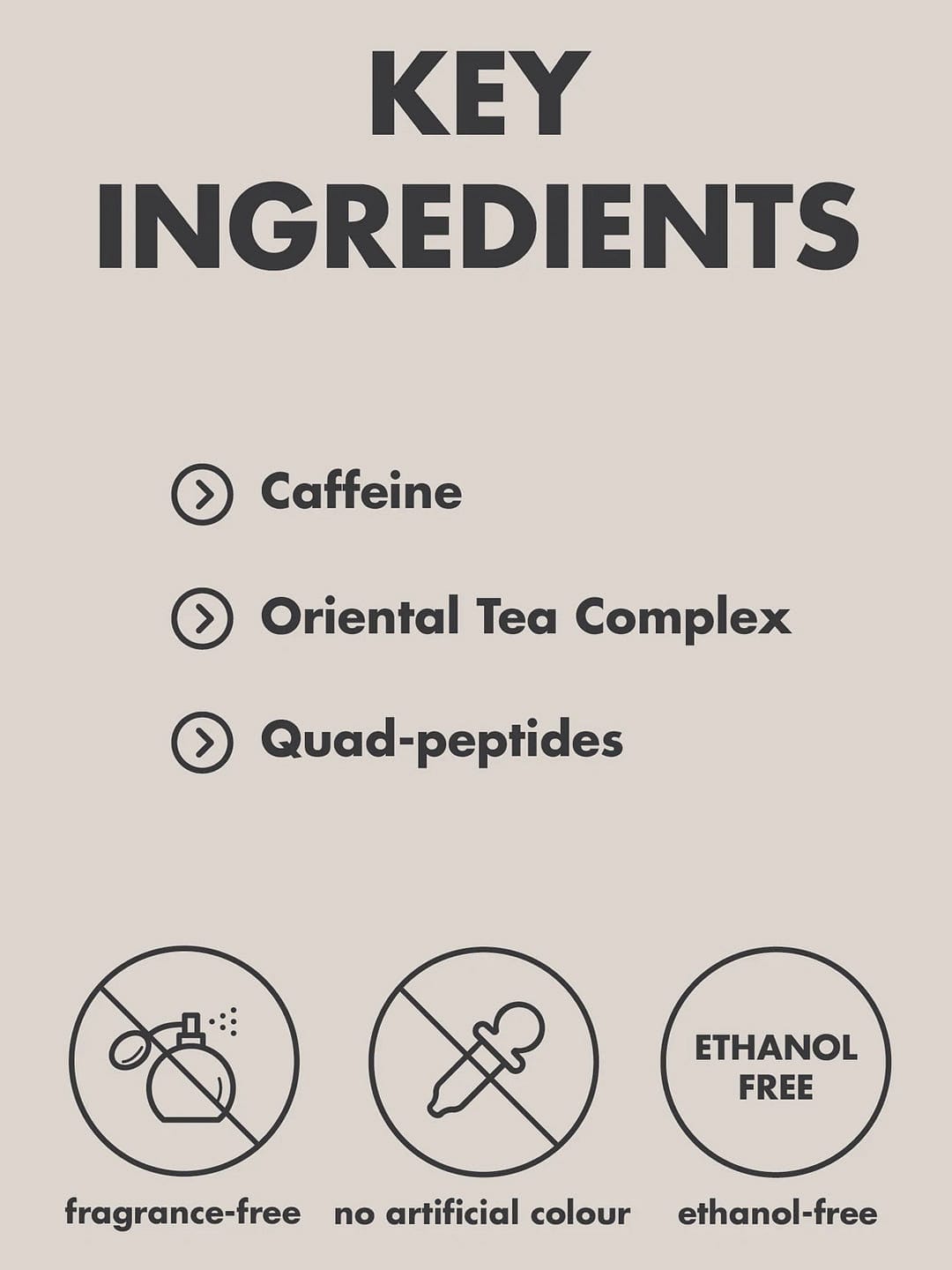 Water, Glycerin, 1,2-hexanediol, Butylene Glycol, Propanediol, Argania Spinosa Kernel Oil, Simmondsia Chinensis (Jojoba) Seed Oil, Tocopherol, Caffeine, Phaseolus Angularis Seed Extract, Artemisia Princeps Leaf Extract, Camellia Sinensis Leaf Extract, Chaenomeles Sinensis Fruit Extract, Chrysanthellum Indicum Extract, Cinnamomum Cassia Bark Extract, Diospyros Kaki Leaf Extract, Perilla Frutescens Extract, Portulaca Oleracea Extract, Acetyl Hexapeptide-8, Copper Tripeptide-1, Oligopeptide-29, Oligopeptide-32, Carbomer, Hydroxyethylcellulose, Hydroxyethyl Acrylate/Sodium Acryloyldimethyl Taurate Copolymer, Polyglyceryl-10 Laurate, Sorbitan Isostearate, Caprylyl/Capryl Glucoside, Sodium PCA, Tromethamine, Ethylhexylglycerin