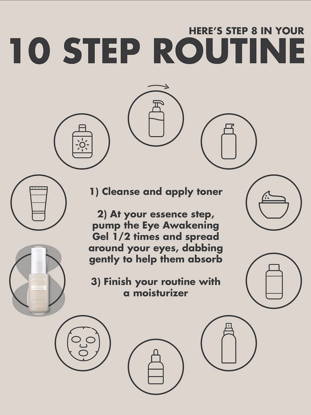 At your essence step, pump the Eye Awakening Gel 1/2 time and spread around your eyes, dabbing gently to help them absorb.