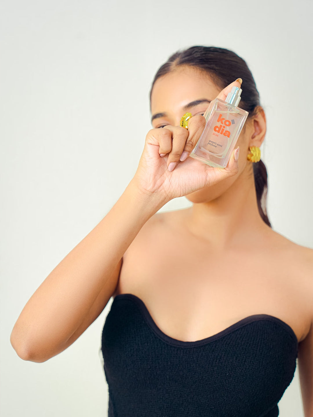 - Spritz Queen's Scent Perfume onto pulse points, such as the wrists, neck, and décolletage.