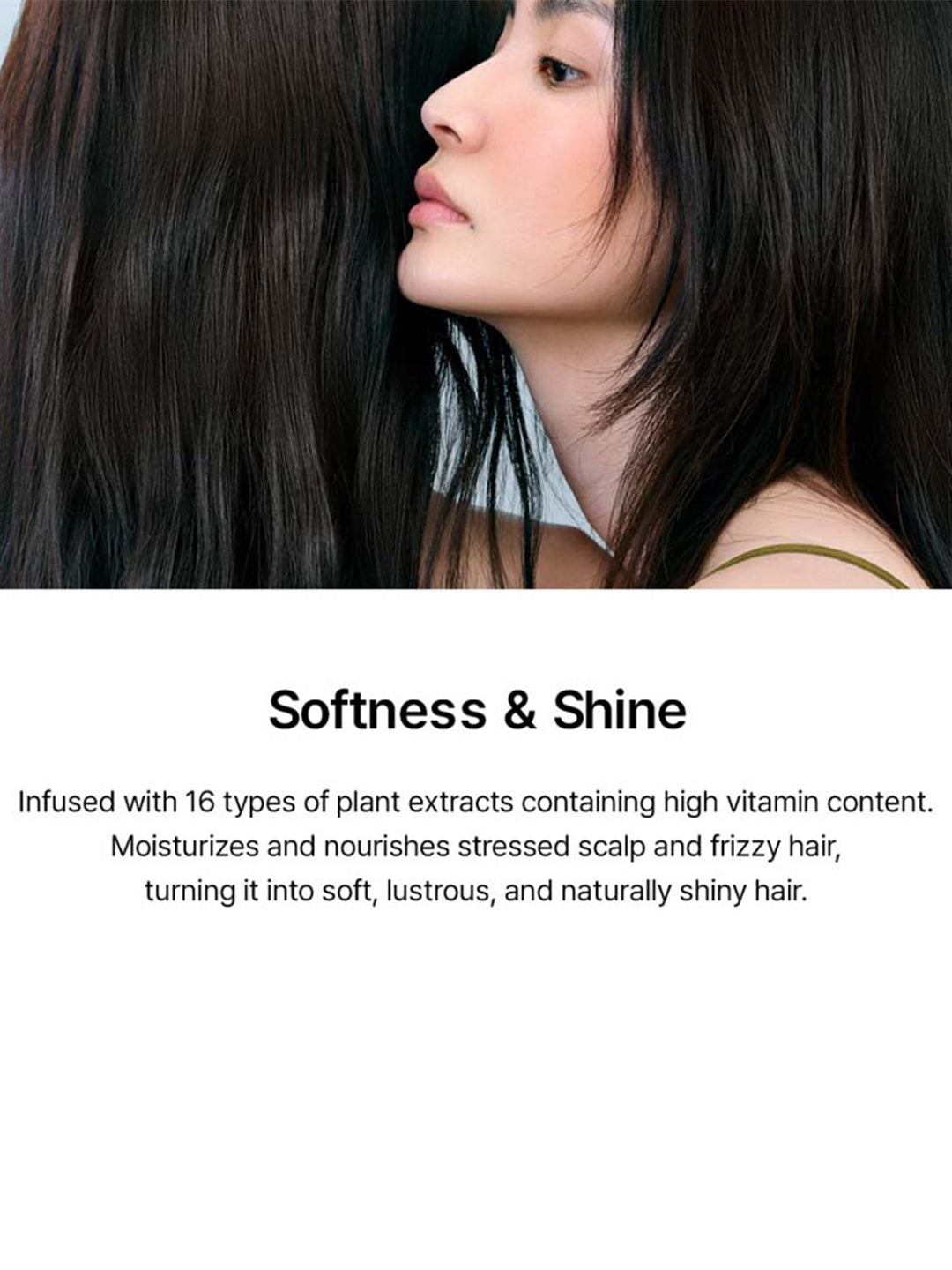 A vegan clarifying shampoo that deeply cleanses away dirt, gently exfoliates, nourishes, and balances hair pH levels. This 6-in-1 shampoo will give your hair & scalp a much-needed nutritional boost. Infused with 16 types of plant extracts it boosts shine, enhances texture, and smoothes frizz and flyaways.