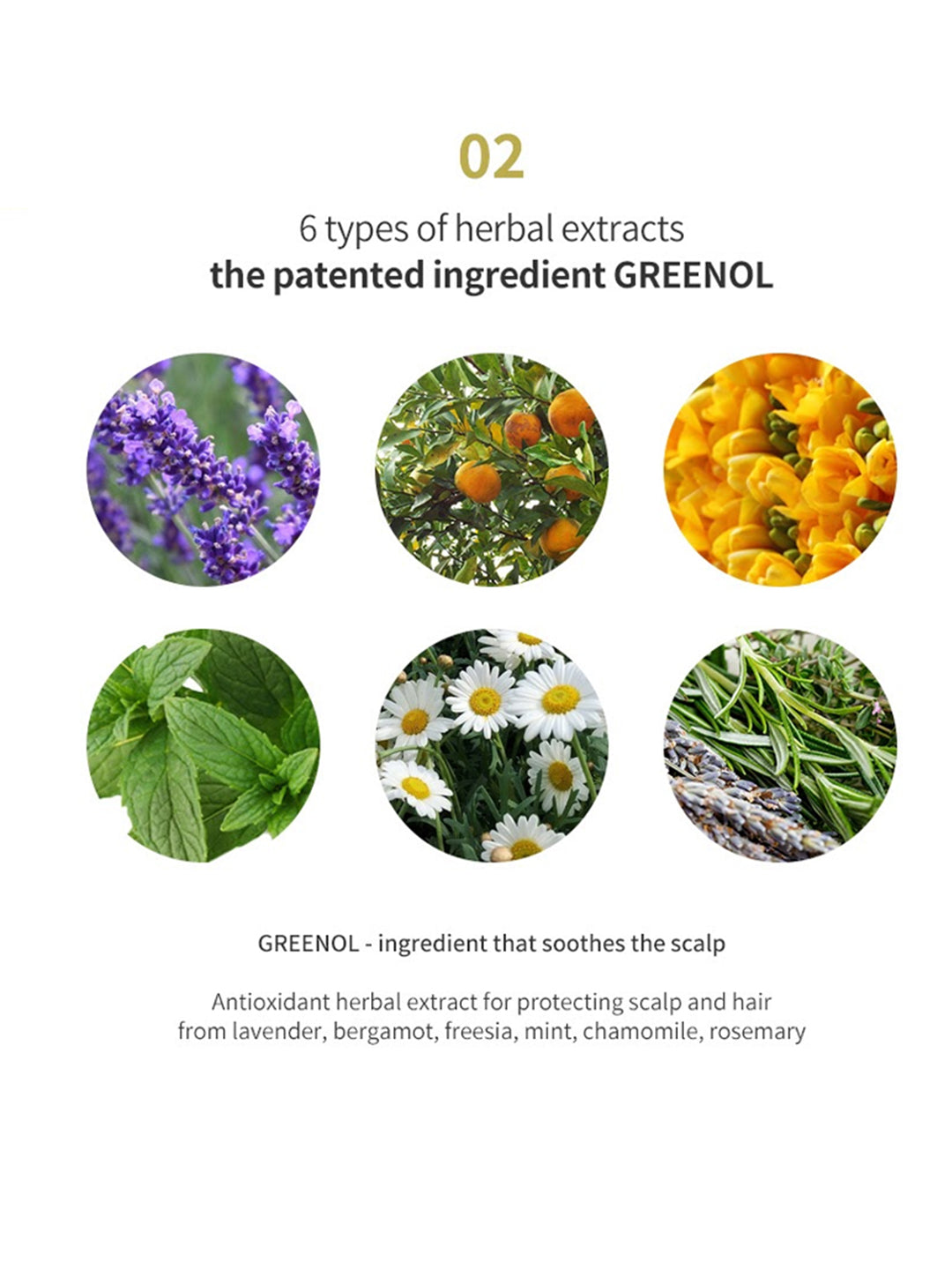 Patented ingredient GREENOL H (Patent No 10-0820010) - contains Lavender, Bergamot, Freesia, Peppermint, Chamomile and Rosemary Extracts which moisturize, soothe sensitive scalp, relieve itchiness, and reduce dandruff.