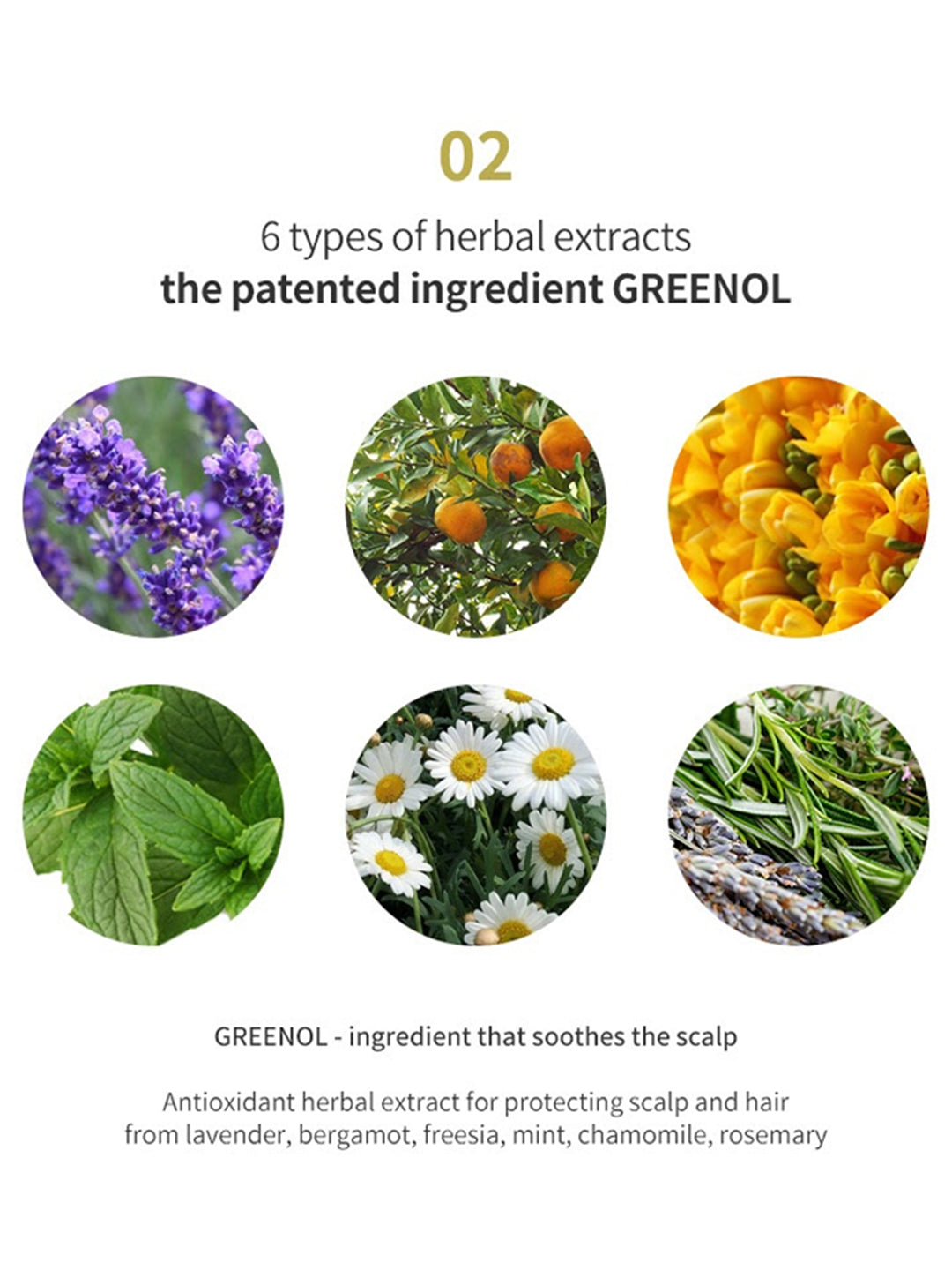 Patented ingredient GREENOL H (Patent No 10-0820010) - contains Lavender, Bergamot, Freesia, Peppermint, Chamomile and Rosemary Extracts which moisturize, soothe sensitive scalp, relieve itchiness, and reduce dandruff.