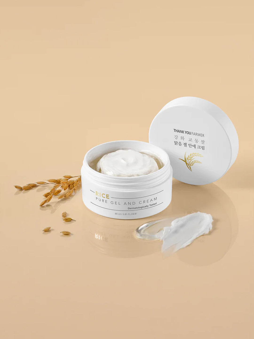 Thank You Farmer Rice Pure Gel and Cream is a 2:1 soothing gel and nourishing cream, with a unique formula to balance the oil and moisture levels of the skin. You can decide the quantity to be used according to the seasons or skin concerns. Gel:Cream (2:1) - during summers, when the skin feels less dry and Gel:Cream (1:2) - during winters, when the skin needs extra hydration. The gel composition contains Green Tea extract for hydration and Convallaria Majalis Bulb extract for skin vitalizing. It also helps to instantly calm down the skin irritated by sun exposure. The cream composition contains Persimmon Extract and Mung Bean Extract for supplying nutrition and strengthening skin barrier and also gives extra hydration. Vitamin E, Vitamin B2 prevents skin's moisture loss. Presence of Rice Extract brightens the skin to give a healthy glow.