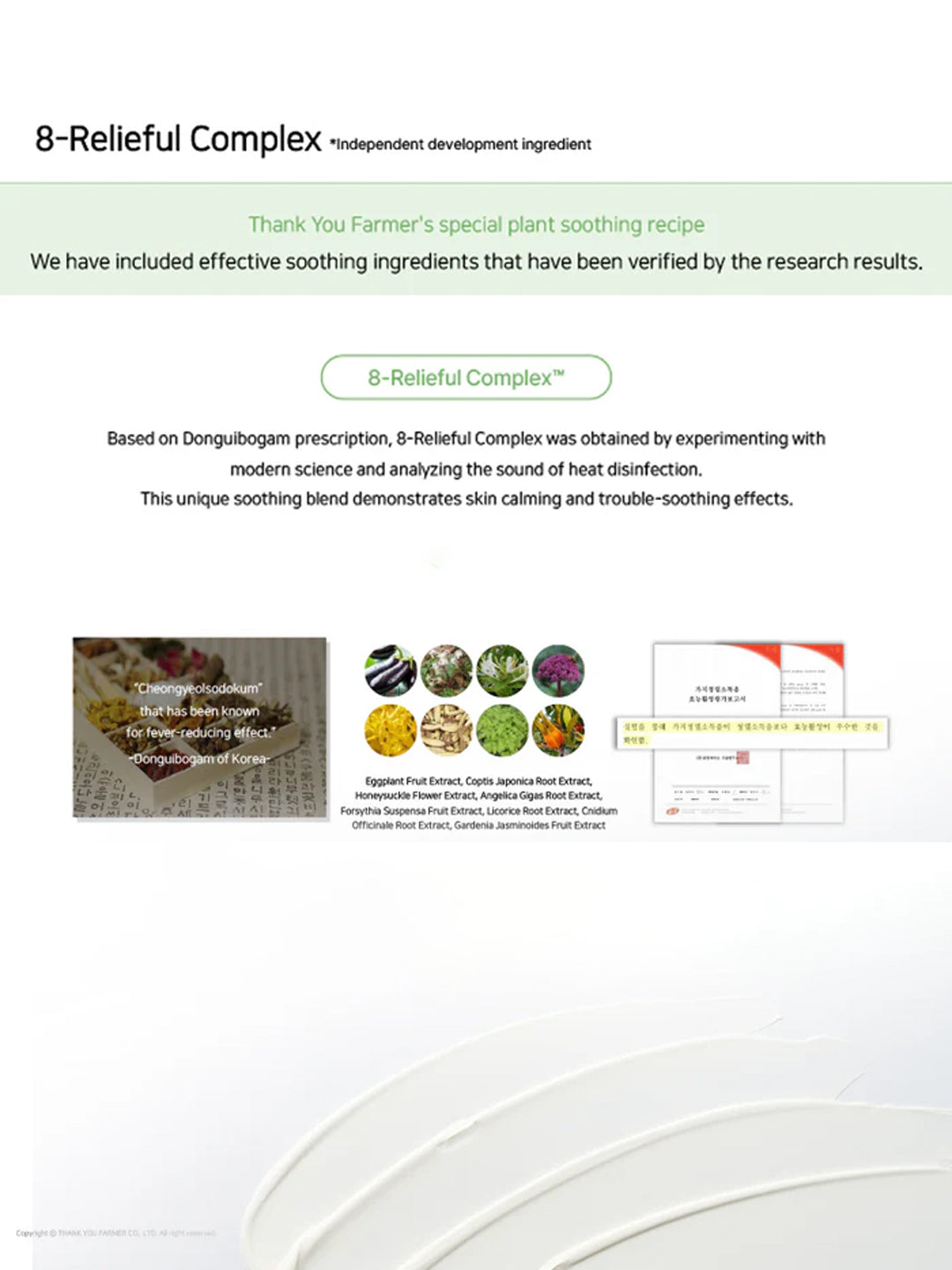 8-Relieful Complex + Centella Asiatica Extracts - Contains TYF’s own developed blends of 8 herbal extracts based on the Korean oriental medicine recipe